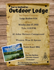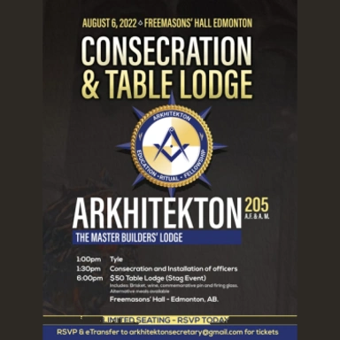 I am directed by our Grand Master, MW Bro Chris Uchman to advise you of the Ceremony of Institution of a regular Lodge to be known and designated as Pearl of the Orient Lodge U.D., to be held Saturday, November 12, 2022 at Chestermere Regional Community Association, 201 W. Chestermere Drive, Room 2, Chestermere, AB T1X 1B2. Read More »