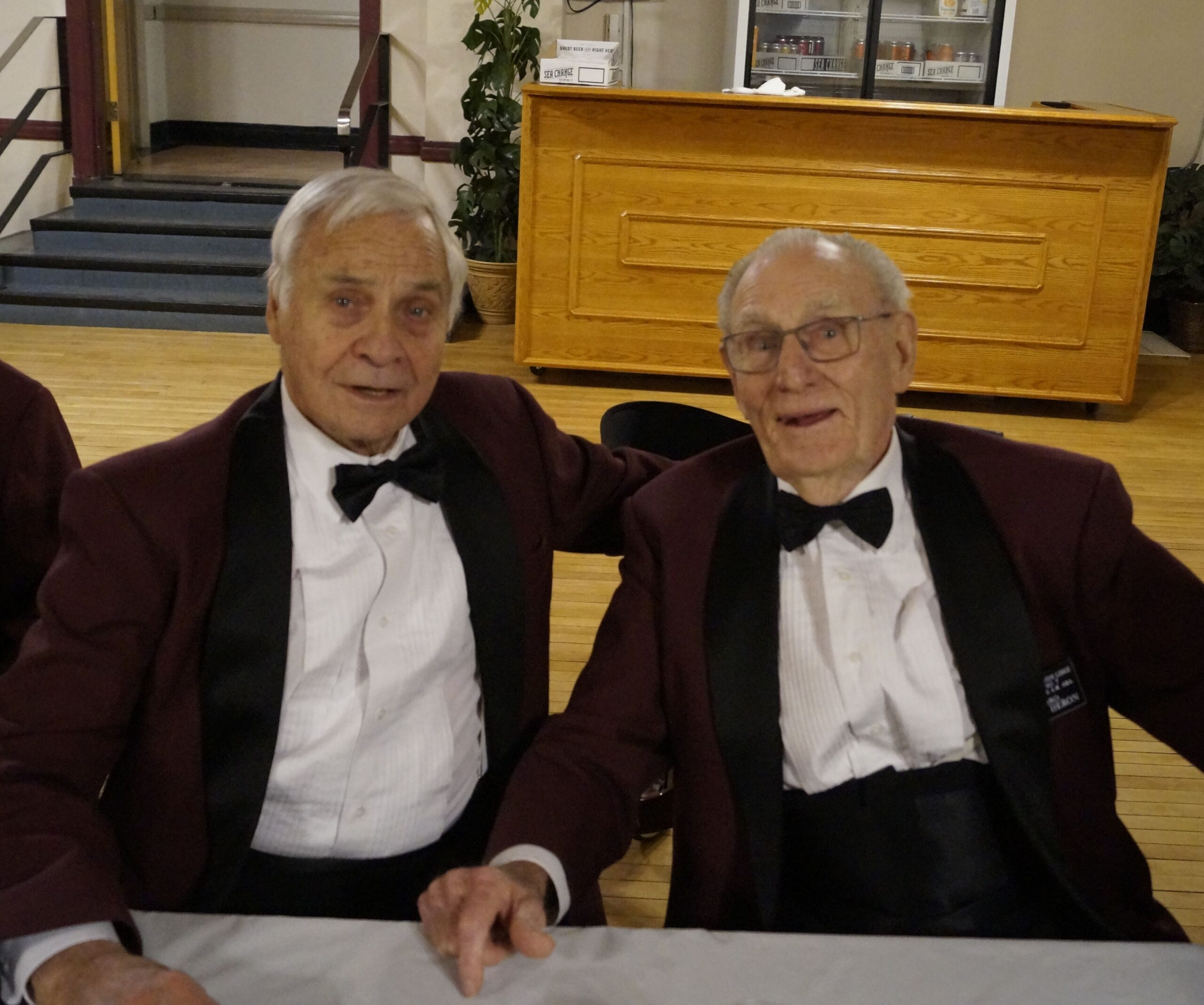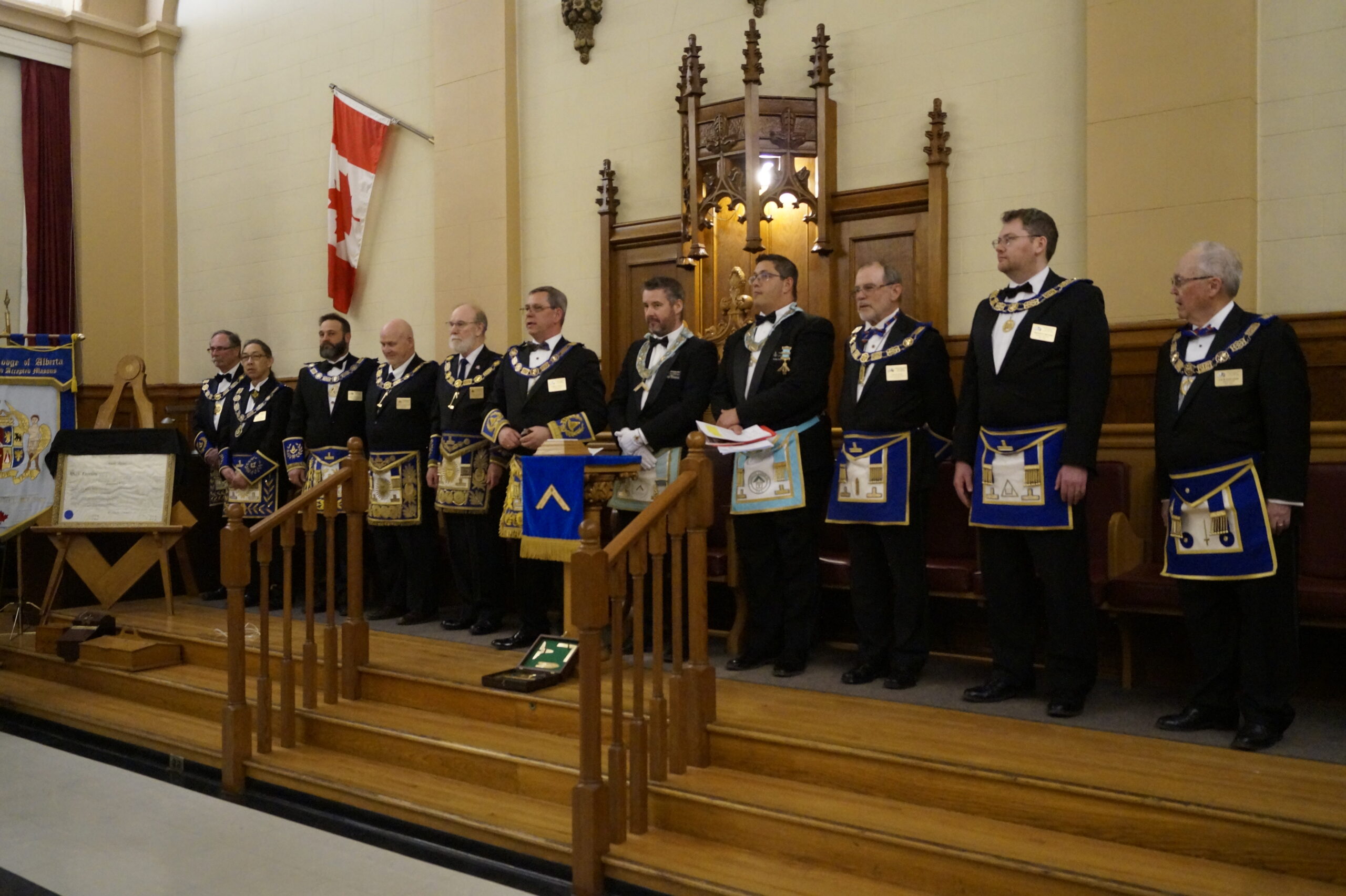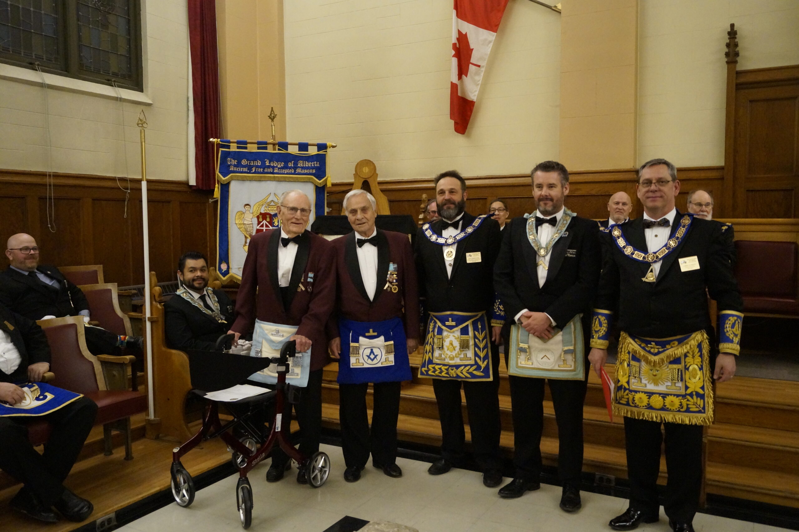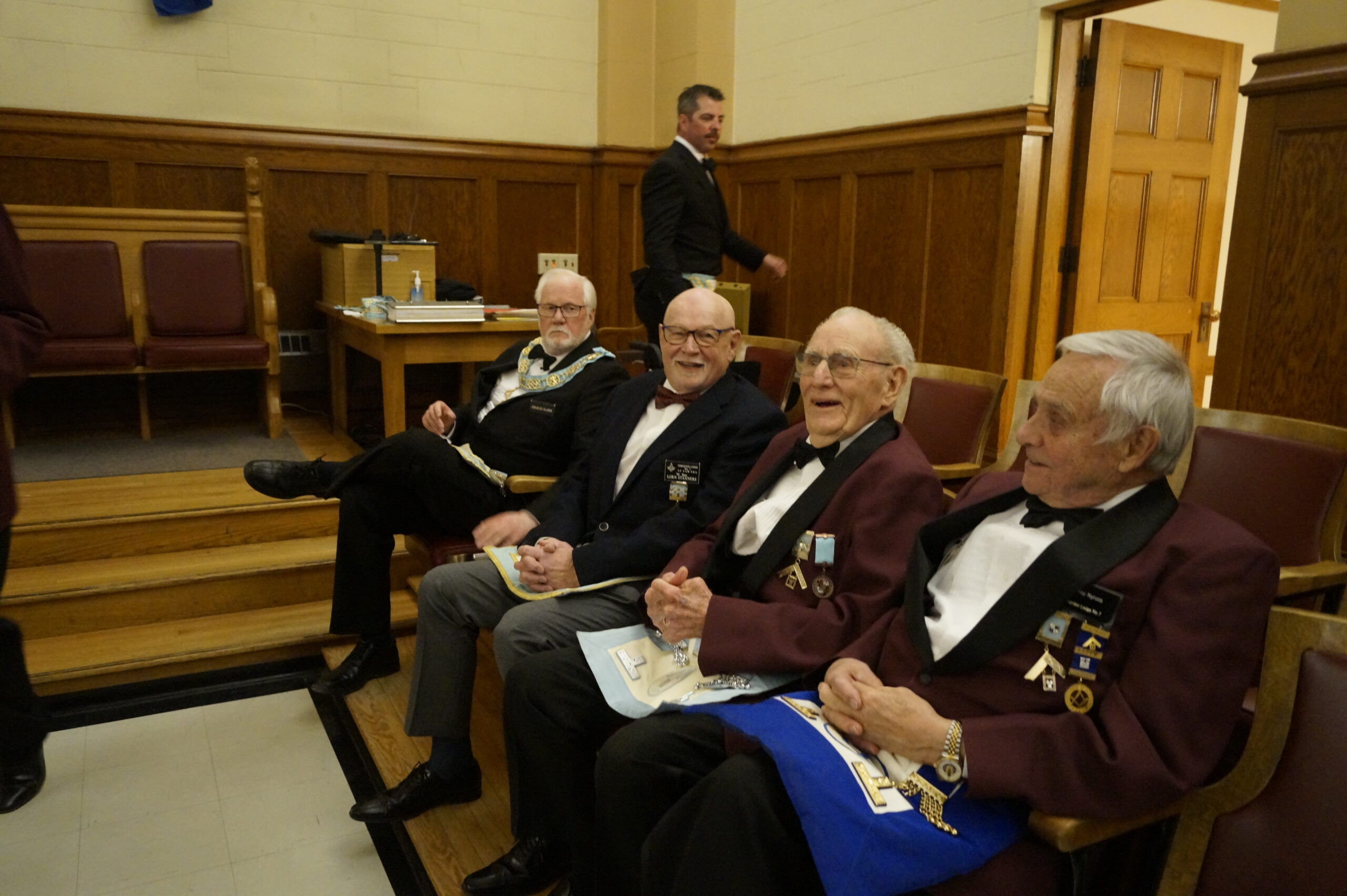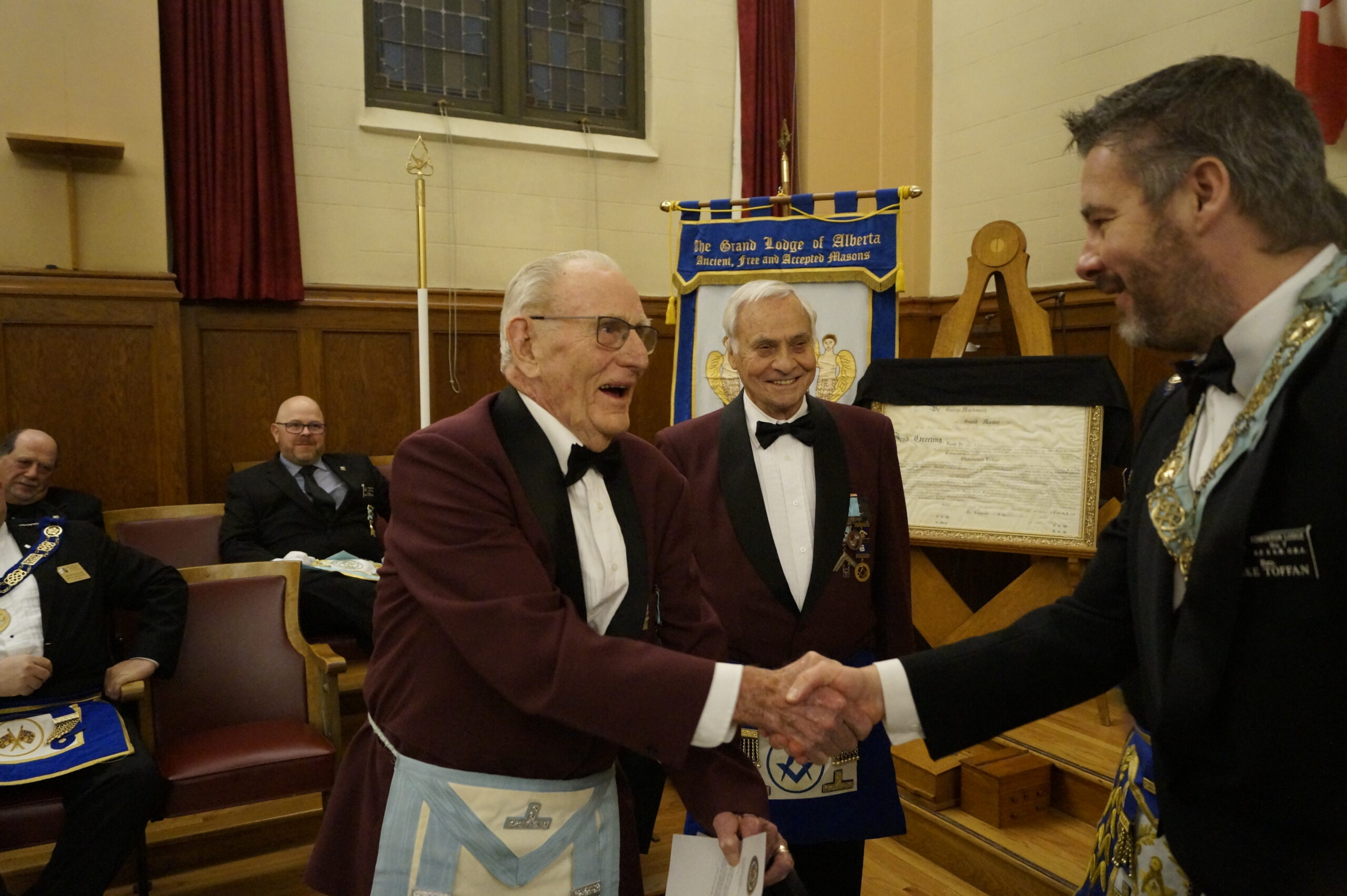 Photos 2023 50 Year Pin to Ray Nyroos, 60 Year Bar to Larry Heron, and PM Certificate to Trever Urchyshyn Chinookarch District Meeting October 2023